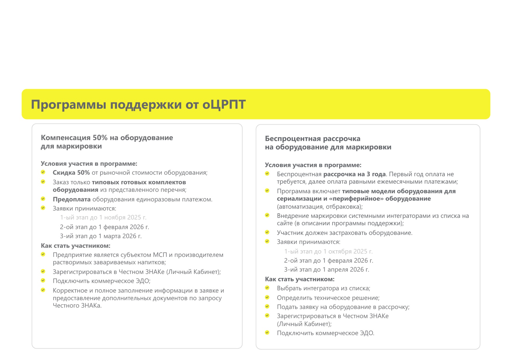 Для производителей растворимых завариваемых напитков, упакованных в потребительскую упаковку, попадающих под маркировку, предусмотрена поддержка «Компенсация 50% затрат на оборудование для маркировки растворимых завариваемых напитков, упакованных в потребительскую упаковку».